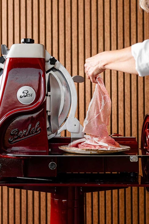 Mit der antiken Berkel Prosciutto-Schneide-Maschine wird der Prosciutto San Daniele hauchdünn und langsam für Sie geschnitten und auf einem Brett mit frischen Taggiasca-Oliven serviert.
